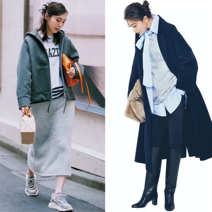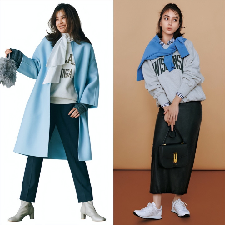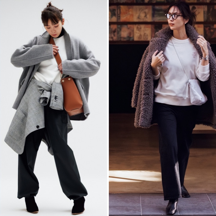 一件灰白渐变的复古卫衣,搭配干净的白色高领衫,瞬间弱化了运动单品的随意。这组配色散发着安静的质感,在复古与优雅间找到了完美平衡,轻松穿出知性书卷气。