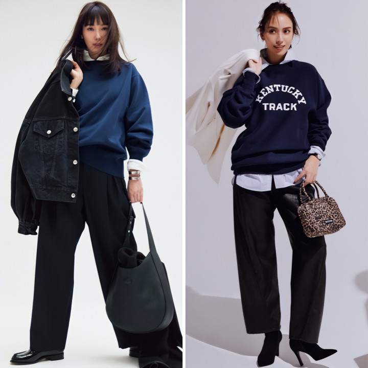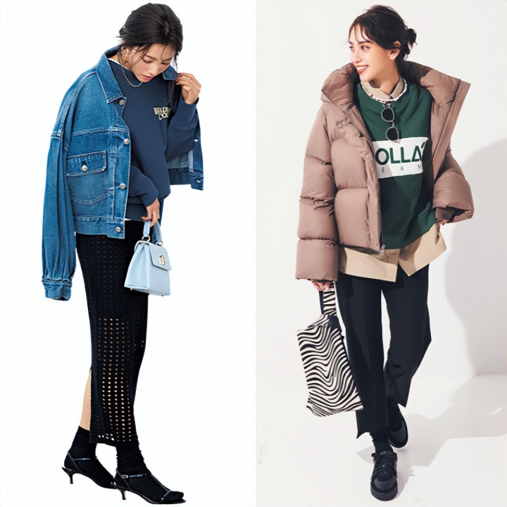Logo卫衣混搭网眼裙,于休闲中注入一丝辛辣。而蓝色卫衣与牛仔夹克的组合,则以同色系叠穿诠释松弛时髦,正是当下心境的完美写照。