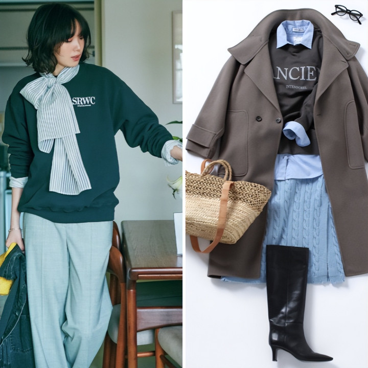 休闲风格的针织衫搭配优雅的蝴蝶结衬衫,这种混搭平衡正是当下的潮流。两者若统一采用浅色系便能自然融合,推荐作为严冬时节转换心情的穿搭方案。