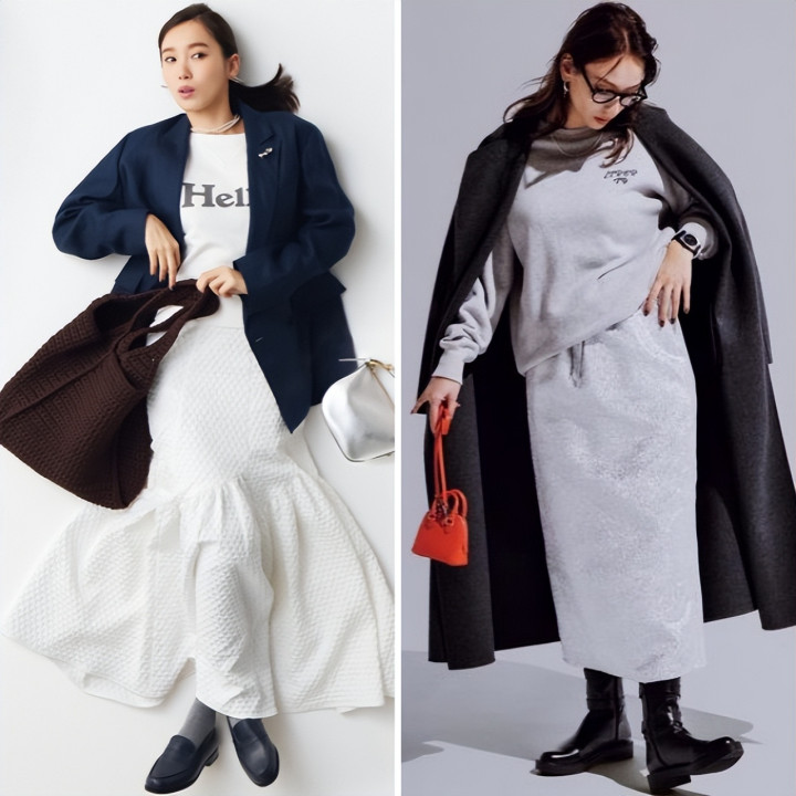 灰色卫衣搭配银色半裙,凭借同色系的高级感统一全身,又借材质碰撞彰显达人功底。别忘了用存在感配饰点睛,瞬间升华整体时髦度。